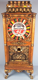 When you see a Caille Lone Star or "45" for the first time you may notice the same cabinet design as the Big Six, Eclipse, & Centaur, but look beyond the cabinet style and it all changes from there. The most unique or big difference would be the color wheels with only 45 spaces opposed to 90, 92, or 120 which are on the other Caille machines, excluding the Big Six which had 12 or 36 depending on the model. They were designed without the use of bugs or cheats and were made to give the operator an edge of 30% in his favor. Like most of the other models in the Caille line up the cabinets were made out of quarter sawn oak or birch and stained to look like mahogany which would then be fitted with antique, nickel, or gold castings. The large and ornate Caille 6-way coin head came in the nickel, quarter, and half dollar denomination.