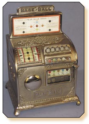 The Caile Baseball machine could be considered the "Mona Lisa" of all the baseball machines,and it is highly sought after by collectors today.This ornate cast iron machine landed on the end of the bar in 1910 and was ready to swallow up some hard earned money.Baseball was the most popular game of the day and many companies would use this game to promote anything wich could make them a little more money.For example;tobacco companies even jumped into the game and put small baseball cards in their tobacco to get the edge.One of those tobacco cards,the 1909 Honus Wagner,sold in 2007 for an astounding $2.35million.
