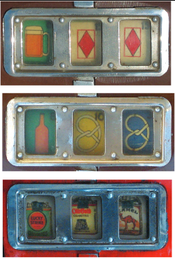 The machines are very simple to play; simply drop a nickel in the slot, pull the handle on the beer tap and the reels will spin. On the beer barrel version the player is trying to win one,two,three,five, or ten beers and in the process will also get a pretzel from the vender on the left side, if desired. Some of the instruction cards will have the beer payouts changed in favor of the store owner. This was done simply by pasting different beer counts over the paper payout card in the front. The first reel on the left shows beer bottles and beer mugs to determine if the payout will be in the form of bottles or a draw. The other two reels on the right show pretzles with five different colored backgrounds. Simply match two of the same colors on the reels to win. There are also diamonds shown on all three reels wich can make for a large beer payout of five or ten.