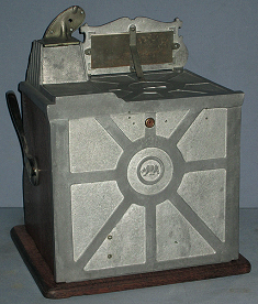 The earliest known Duos have surfaced with an interesting front casting. They don't have Fey's initials or the Indian cast on either side of the jackpot but they still retain Fey's initials on the handle and the top casting. Serial #12 and #25 represent such examples. I can only imagine a disheartened Charles Fey standing in his workshop assembling the first batch of Duo's only to discover that once the top sign was in place, it would ultimately hide the top casting decorated with a large badge containing the letter “F” representing his name and hard work. The handle contained his initials in the center but since it can only be seen from the side of the machine he wouldn't get much recognition. He obviously dressed up the next batch starting with serial #26 and added his initials and the Indian to the front. He first used the Indian symbol in 1909 on The Little Chief. When talking with Marshall Fey about his grandfather using the two images of the bear and Indian, he thought it was possibly because California's biggest sports teams at that time were the California Bears and the Stanford Indians.