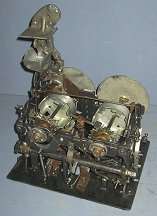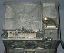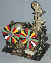 The Duo mechanism doesn't resemble the other two wheel color match machines as it has a gooseneck coin entry. The mechanism has cast aluminum cups with notches on the back that are placed on each wheel shaft and a center T-bar between them to detect payouts. The other two wheel machines will typically have thin hollow cylinders on each wheel shaft with holes everywhere to identify payouts. The Duo mechanism started out with only five colors on the wheel but Fey eventually added a blue color to make six different payouts, possibly to keep up with the bell machines at that time.